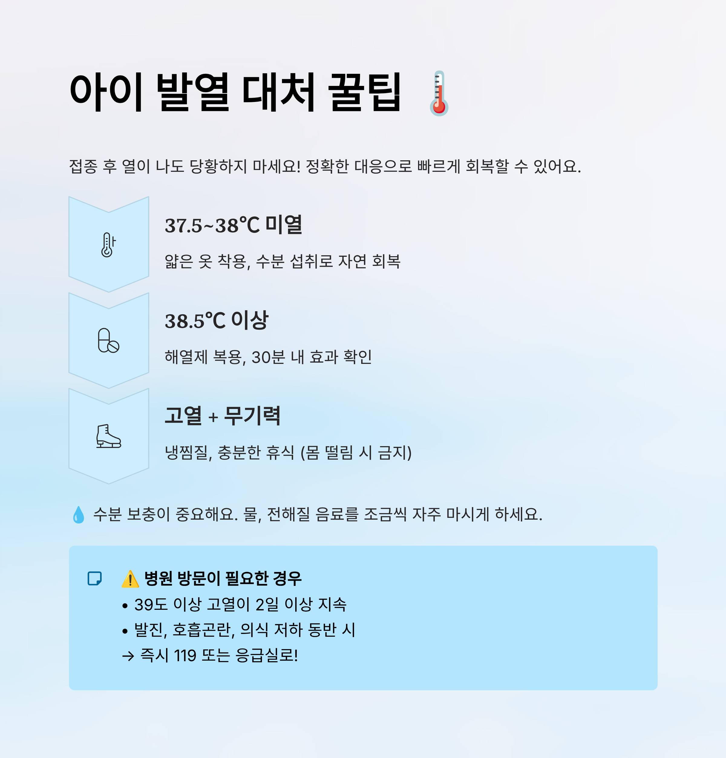 📋 응급상황이 아니라면, 대부분의 발열은 1~2일 내로 회복돼요. 그러나 접종 후 발진, 호흡곤란, 의식 저하 같은 증상이 함께 나타난다면 즉시 119 또는 응급실로 이동해야 해요!