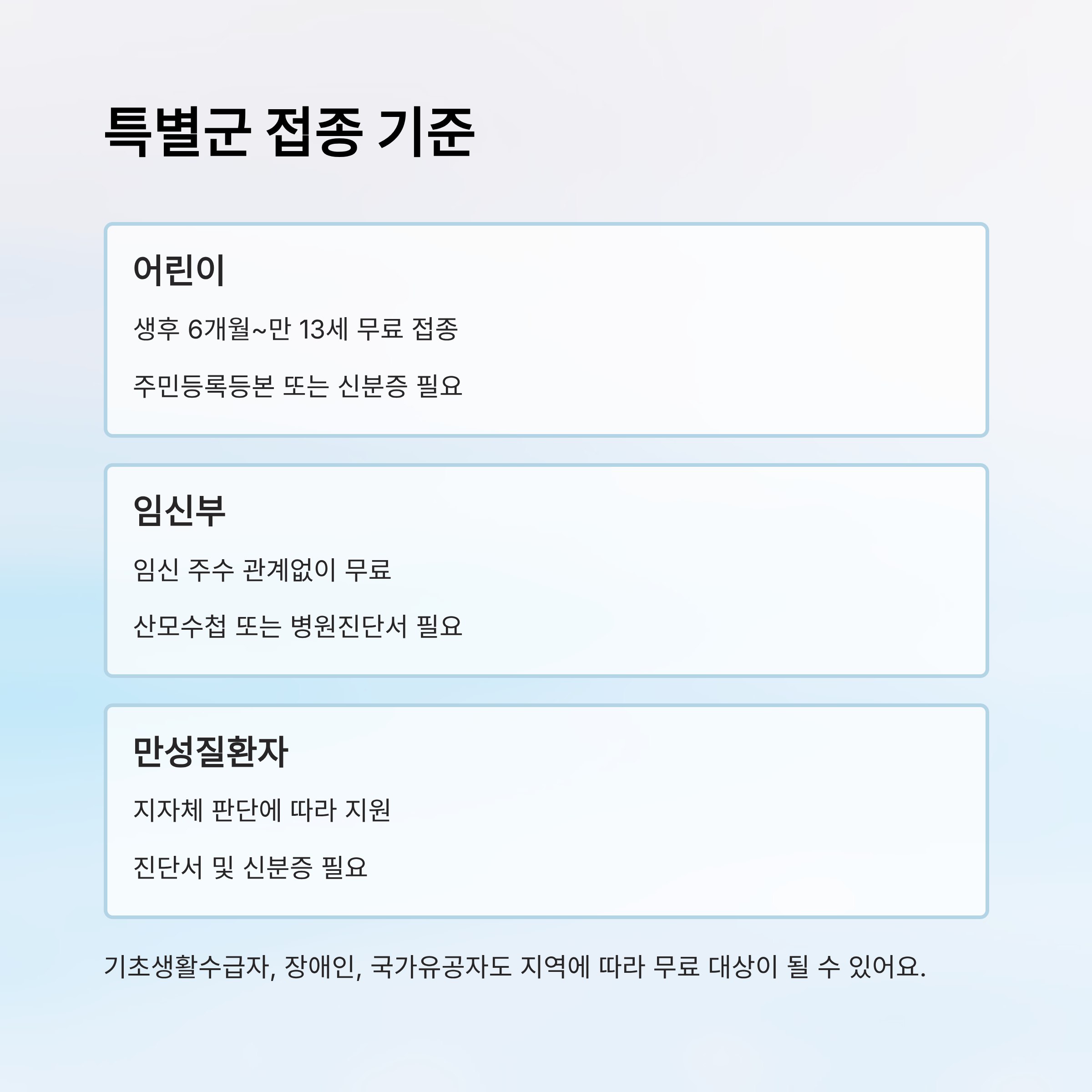 이 외에도 만성질환자, 중증 장애인, 사회복지시설 입소자, 국가유공자 등은 지자체별로 무료 지원 여부가 달라지니 거주 지역 보건소나 병원에 문의하는 게 좋아요.