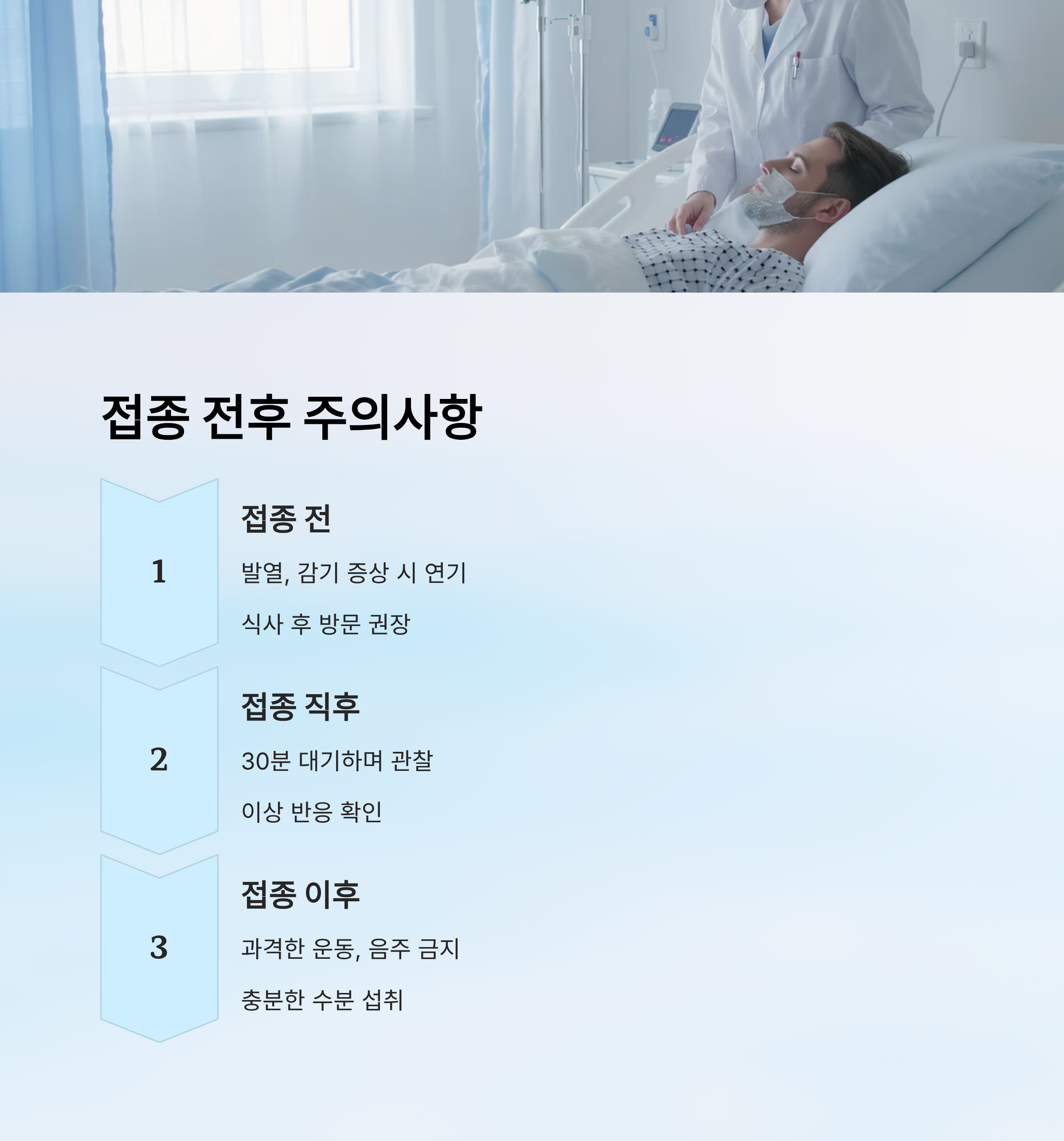| 접종 이후 | 과격한 운동 금지 / 음주 금지 / 수분 섭취 |