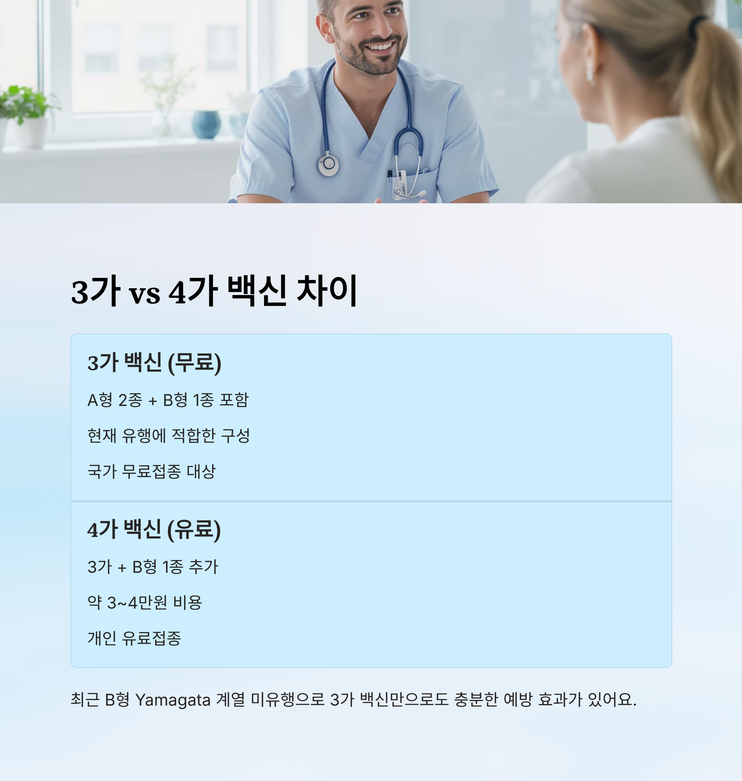 백신 선택은 나의 건강 상태와 예산에 따라 결정하되, 2025년엔 3가 백신으로도 충분히 독감 예방이 가능하다는 점을 기억해 주세요. 🙆♂️