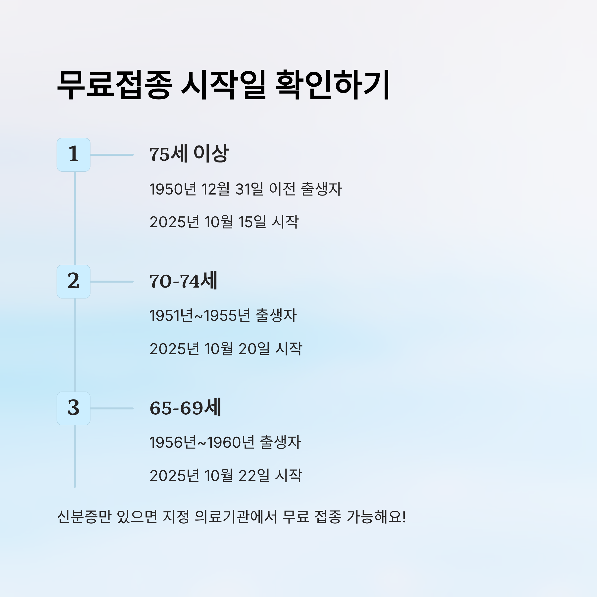 만약 1960년 12월 31일 이전 출생자라면 2025년 기준 만 65세 이상이기 때문에 접종 대상에 포함돼요. 연령에 따라 시작일이 다르기 때문에 아래 표를 꼭 확인해주세요.