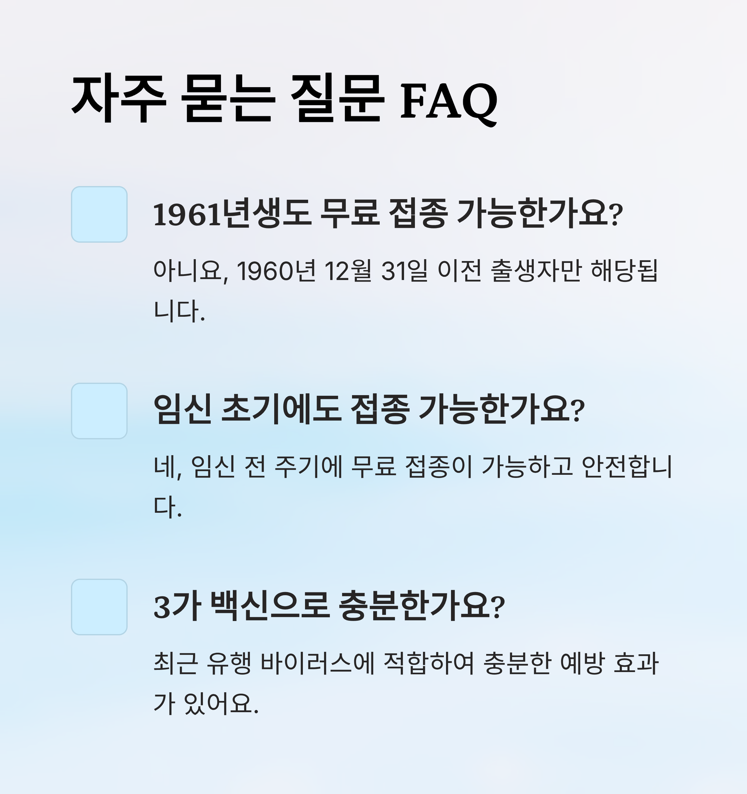 A1. 아니요, 2025년 기준 무료 접종 대상은 1960년 12월 31일 이전 출생자부터예요.