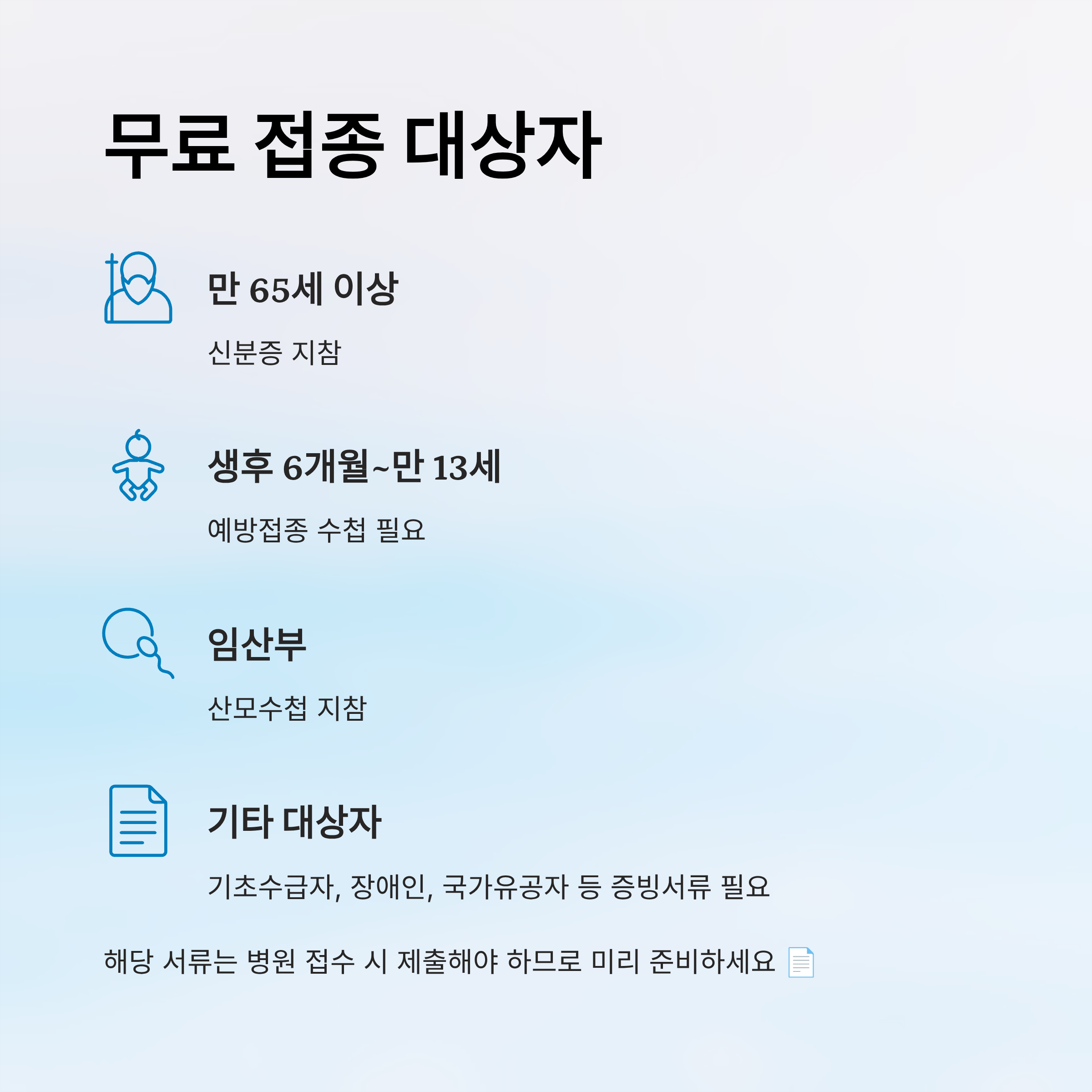 2025년에도 보건복지부에서 지정한 무료 접종 대상자는 혜택을 받을 수 있어요. 하지만 매년 조건이 조금씩 달라지기 때문에 꼭 확인이 필요해요!