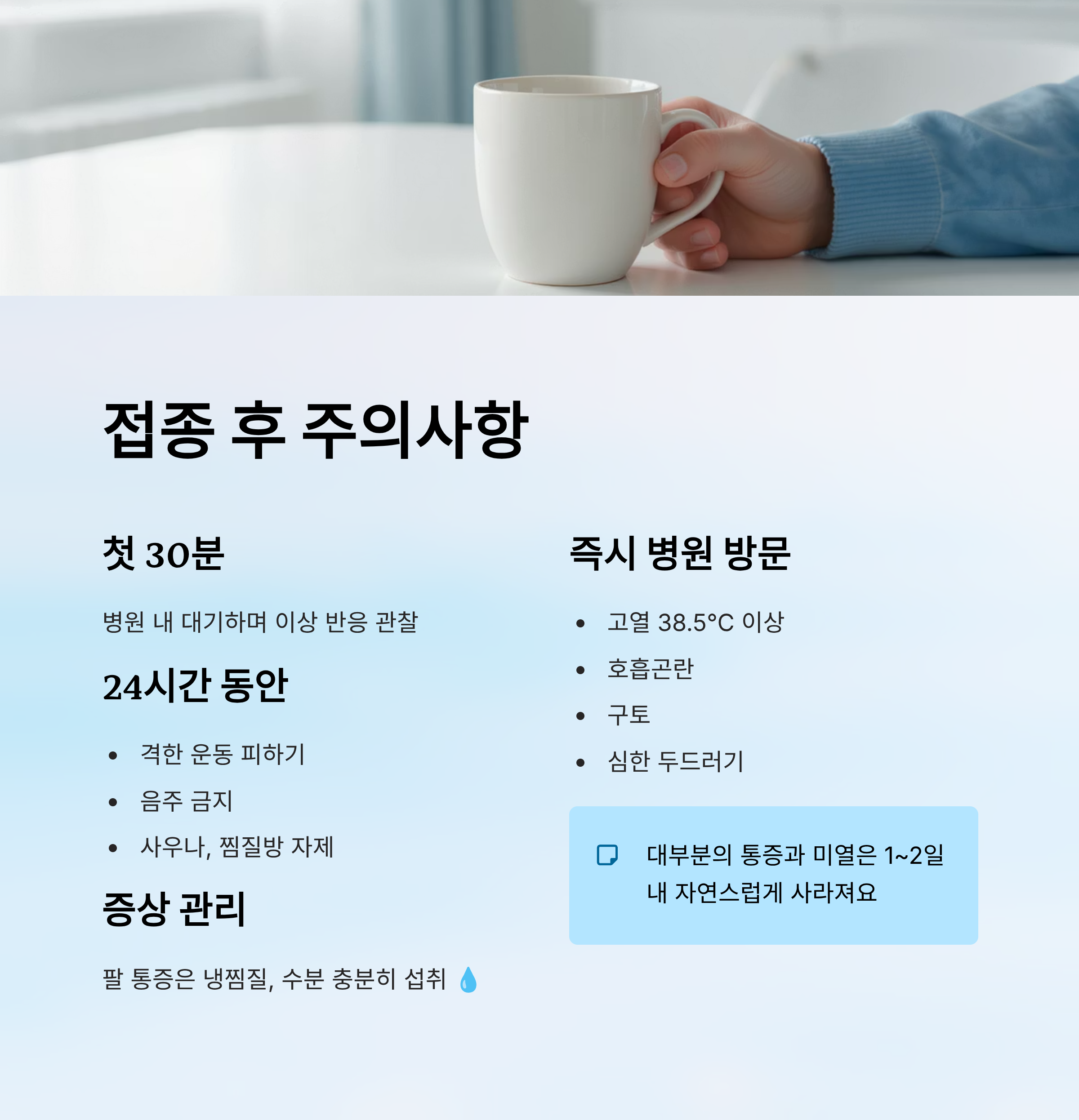 접종이 끝났다고 끝난 게 아니에요! 💉 접종 후에도 주의할 점이 꽤 많거든요. 특히 첫 30분은 병원 내에서 대기하는 게 좋아요. 이상 반응이 나타날 경우 바로 조치할 수 있기 때문이에요.