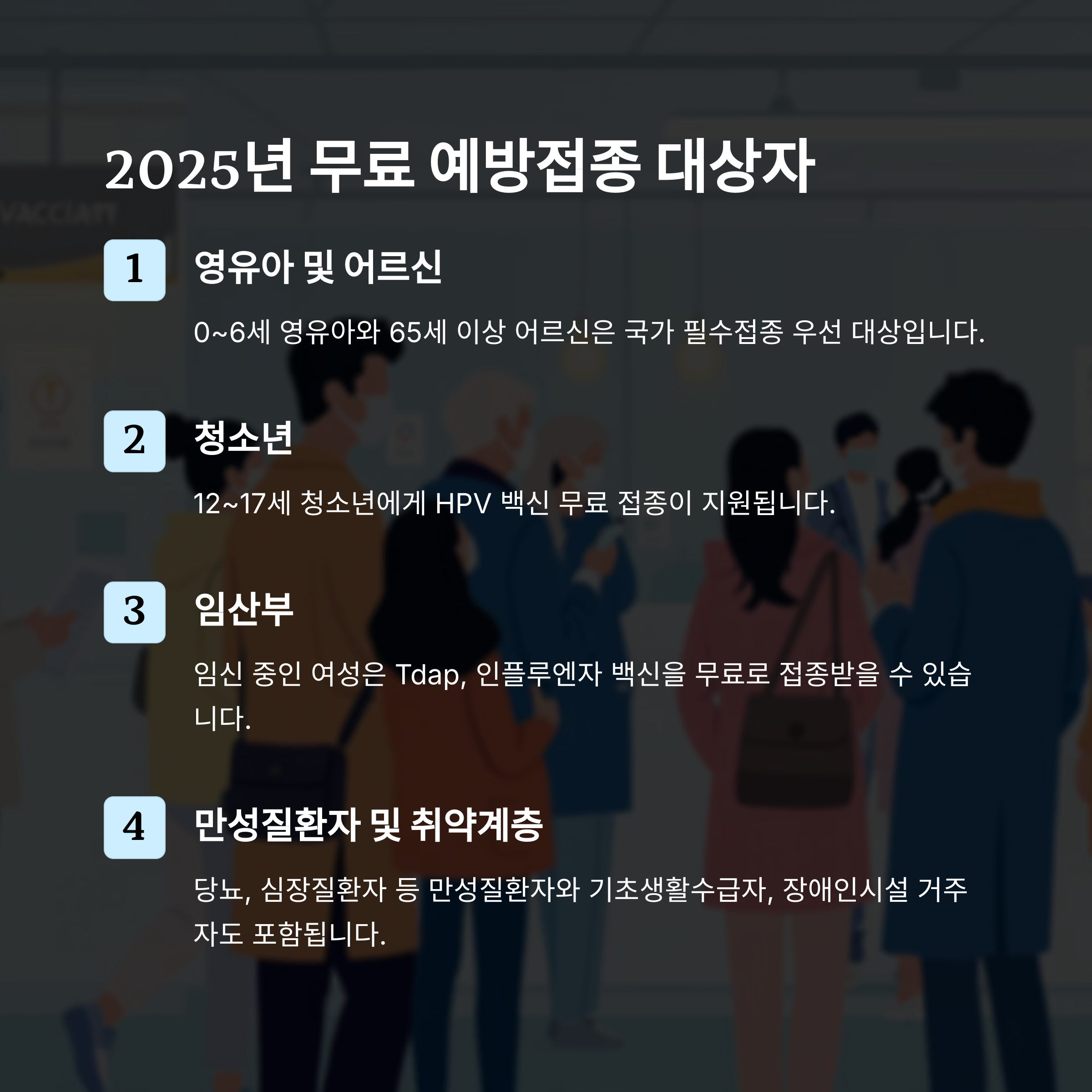 2025년에는 기존보다 더 많은 사람들이 무료 예방접종의 혜택을 받을 수 있게 되었어요. 정부가 공공보건의 사각지대를 최소화하기 위해 대상군을 대폭 확대했답니다. 이제는 어린아이와 어르신뿐만 아니라, 청소년과 만성질환자, 심지어 사회복지시설 종사자까지 포함돼요.