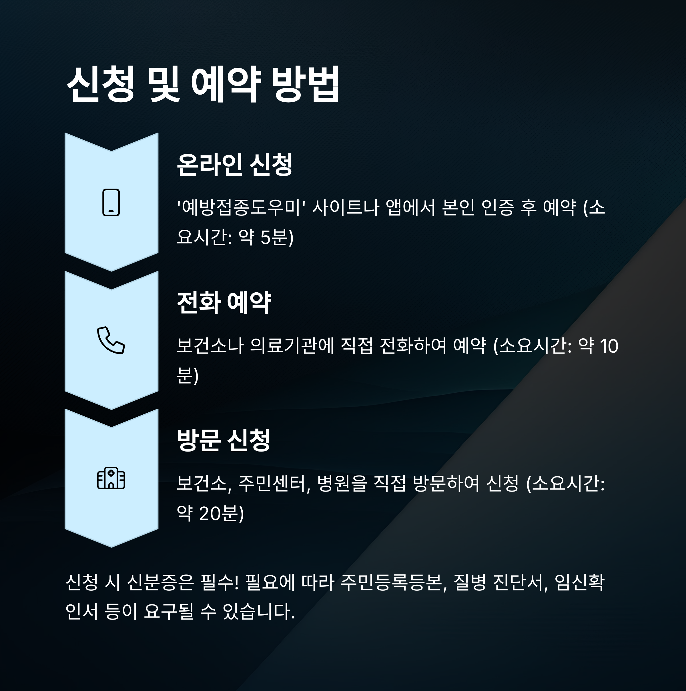 신청할 때는 반드시 신분증을 지참해야 해요. 대상자 확인을 위해 필요한 경우 주민등록등본이나 질병 진단서, 임신확인서 등이 요구될 수도 있으니, 미리 준비해두면 접종 당일 훨씬 수월하답니다. 😊