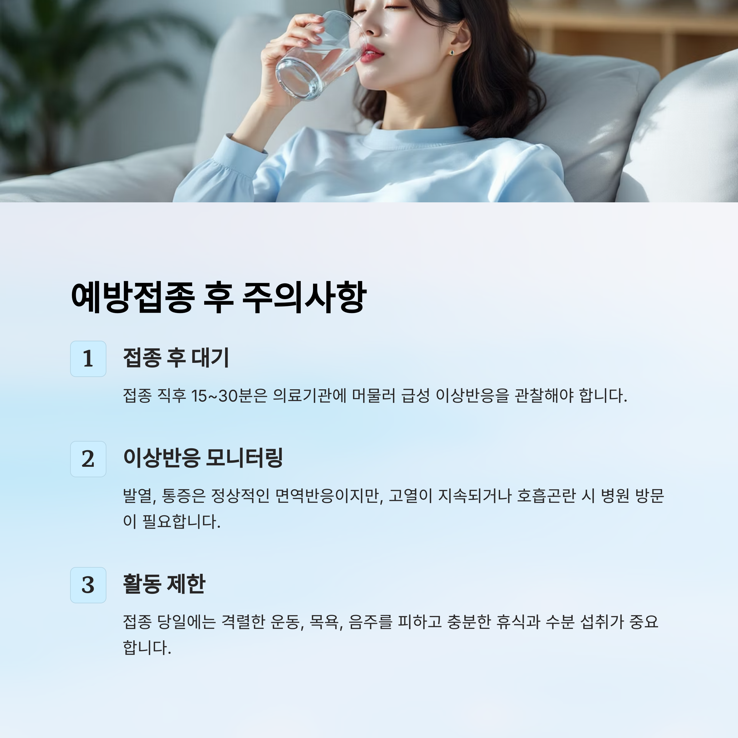 접종 당일에는 격렬한 운동, 목욕, 음주 등을 피하는 게 좋아요. 몸이 면역 반응을 준비하는 상태이기 때문에 휴식과 수분 보충이 매우 중요하답니다. 특히 어린아이들은 충분히 재워주고, 어르신들도 무리하지 않도록 주의해주세요.