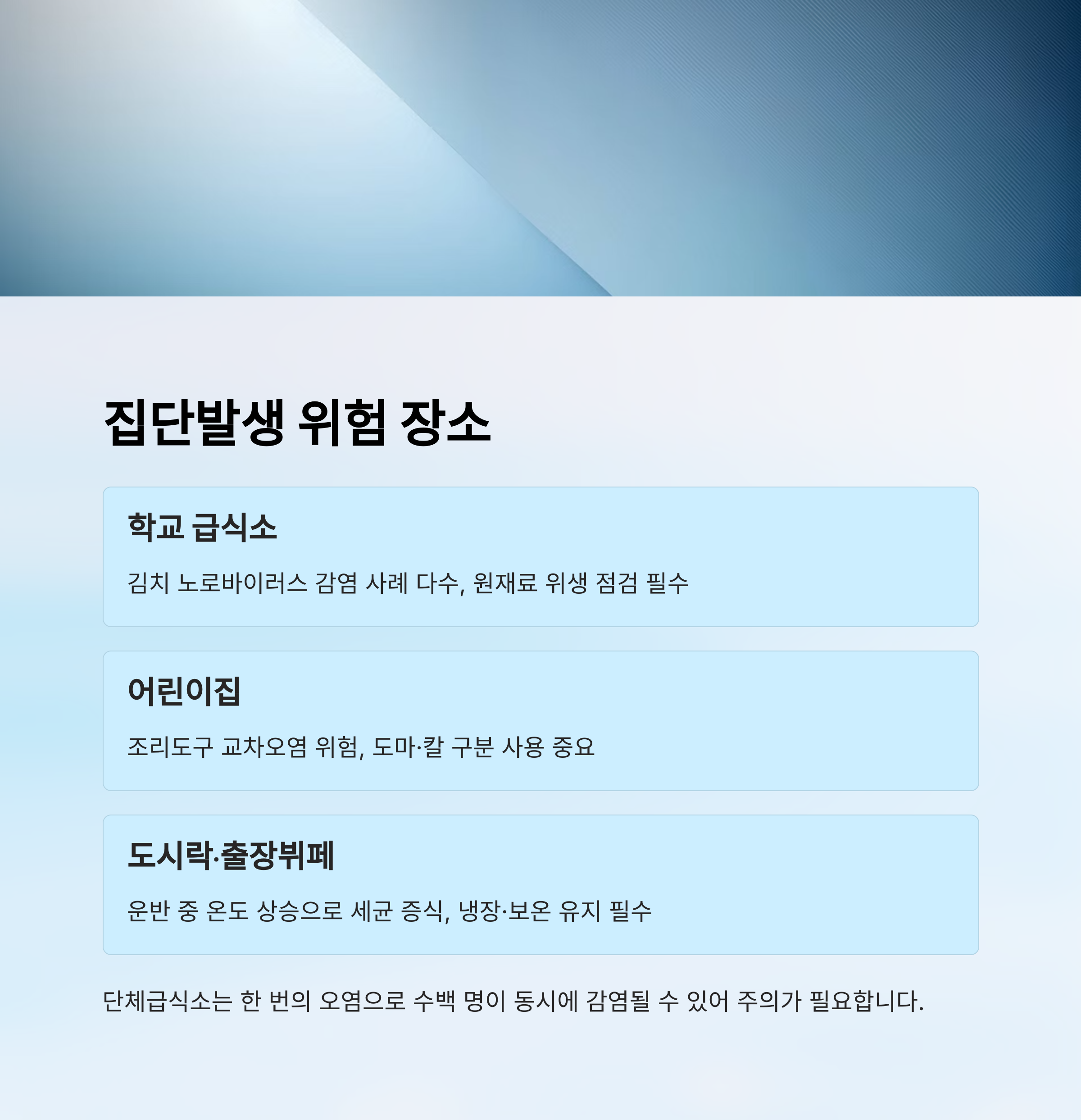 식중독은 대부분 개인보다는 여러 사람이 함께 식사하는 공간에서 발생하는 경우가 많아요. 특히 학교, 어린이집, 요양시설, 회사 구내식당 등 단체급식소에서 집단 감염이 자주 보고되고 있어요.