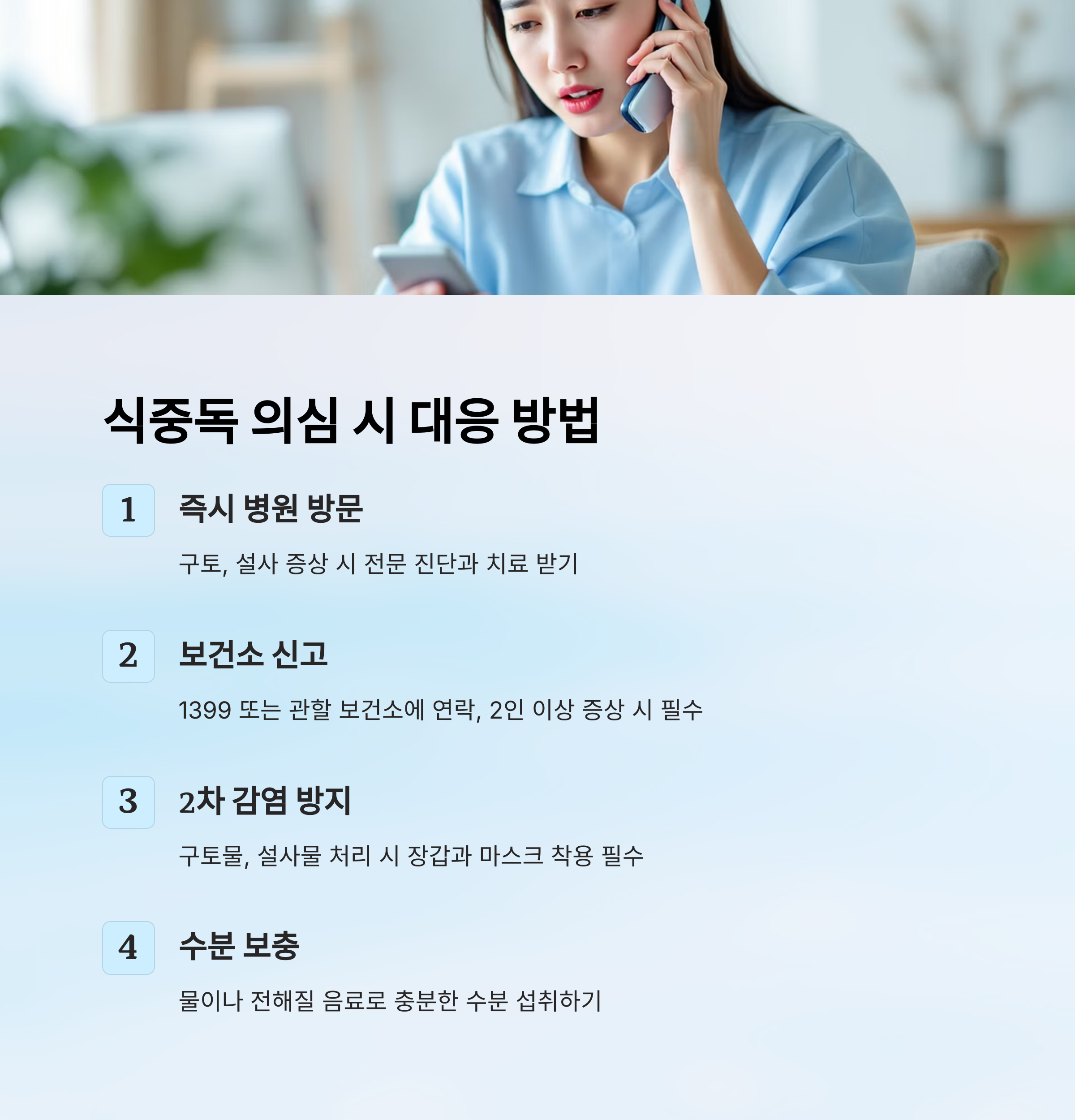 | 의료기관 방문 | 구토, 설사 등 발생 시 즉시 진료 | 수분 보충 병행 |