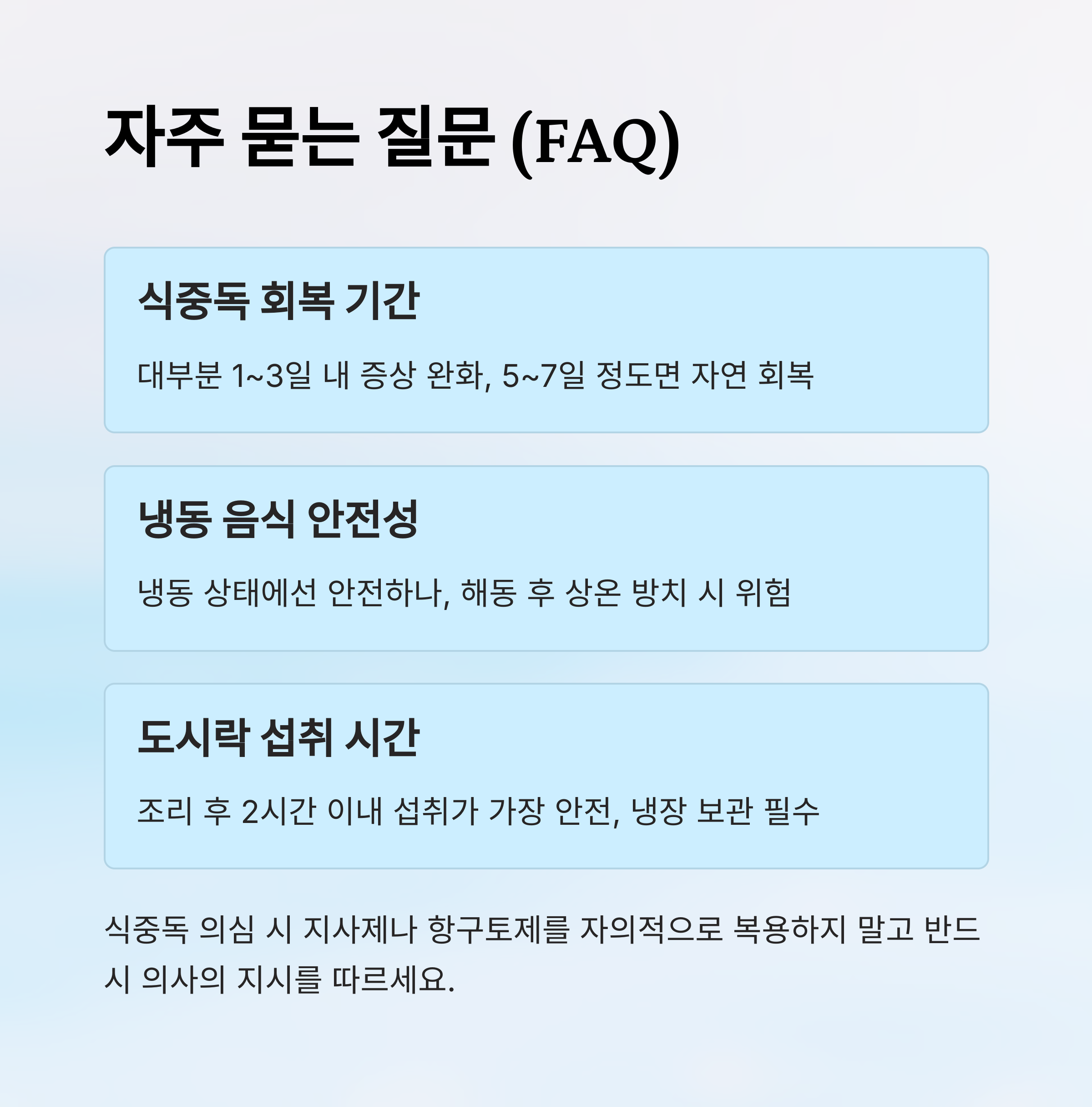 A1. 대부분의 식중독은 1~3일 내에 증상이 완화되고 5~7일 정도면 자연 회복돼요. 하지만 영유아, 고령자, 면역저하자의 경우 증상이 오래가거나 악화될 수 있어요.