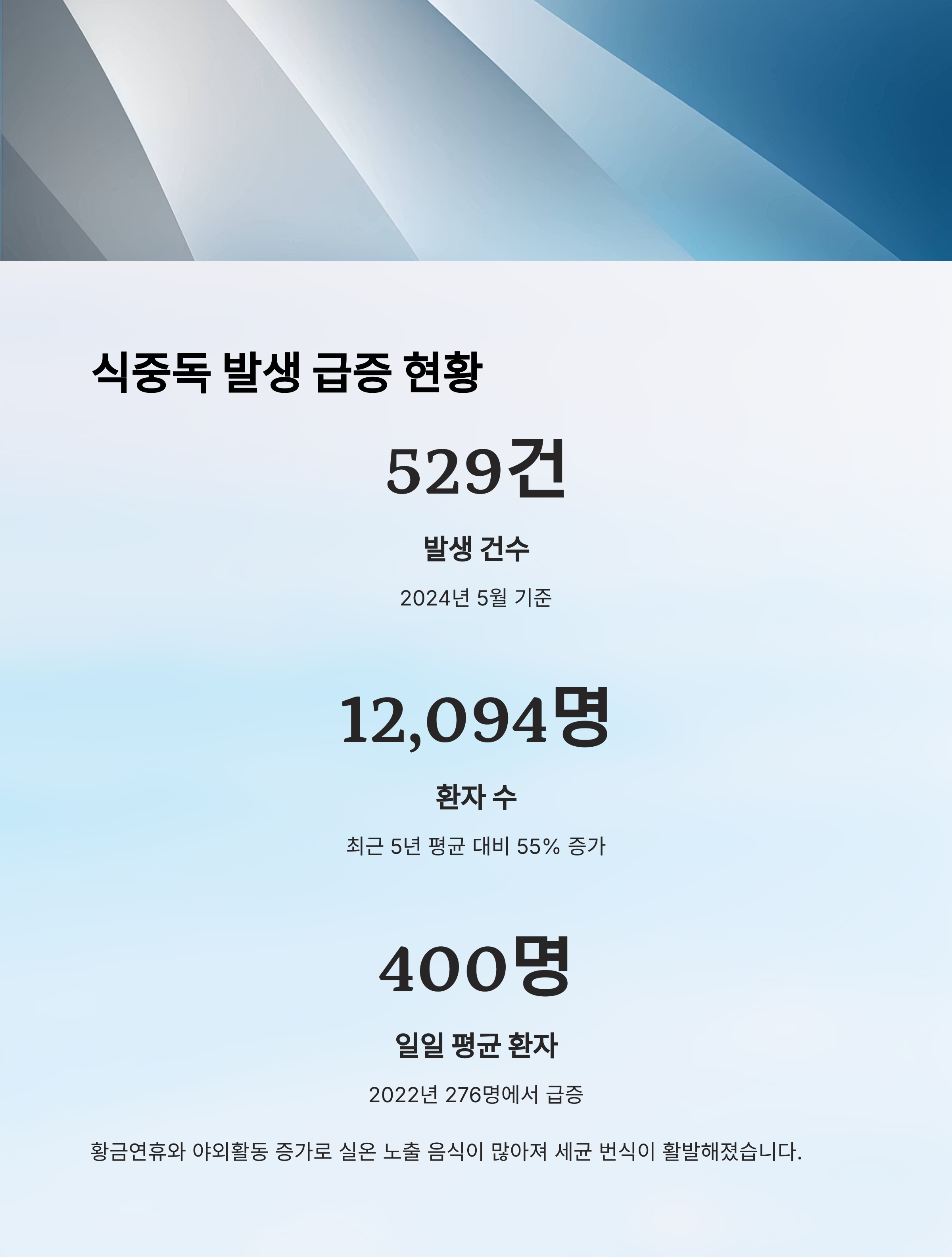 이러한 증가 추세는 2023년부터 이어지고 있고, 점점 더 다양한 장소와 원인으로 식중독이 발생하고 있어요. 그래서 지금 이 시점에서는 '예방'이 무엇보다 중요해요.