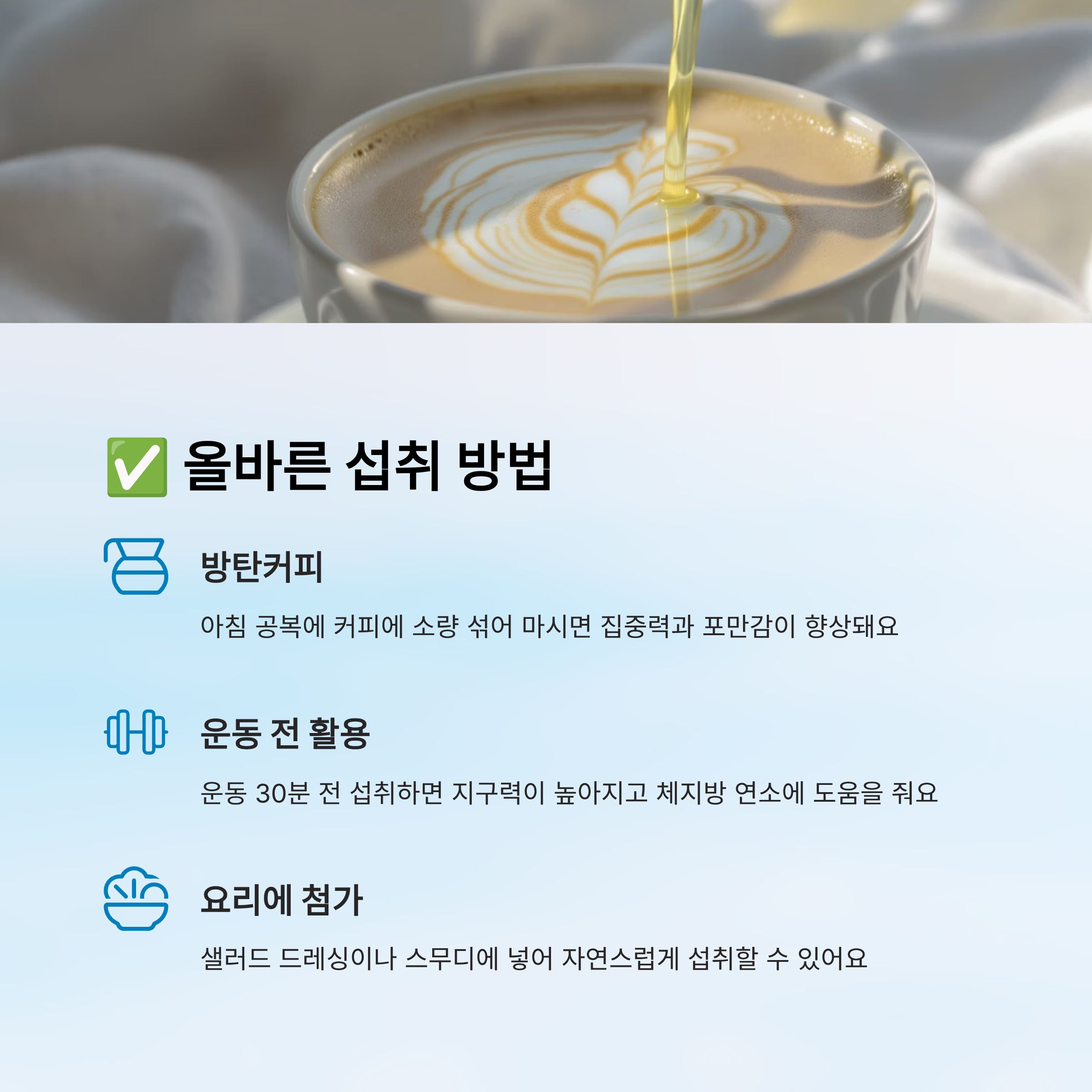 첫째, 아침 공복에 커피나 따뜻한 물에 소량 섞어 섭취하는 방법이에요. 이렇게 하면 빠르게 케톤체로 전환되어 두뇌 에너지를 높이고, 오전 내내 포만감을 유지할 수 있어 간헐적 단식과도 궁합이 잘 맞아요. 실제로 직장인들이 많이 활용하는 루틴 중 하나예요. ☕