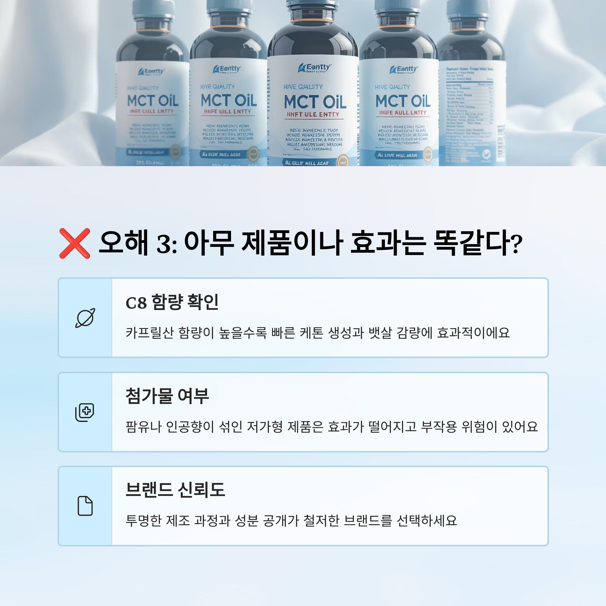 A6. 아니에요. C8·C10 함량, 첨가물 여부, 원료 출처를 꼭 확인해야 해요. 저가형 제품은 팜유나 인공향이 섞여 있는 경우가 많아 효과가 떨어지고 위장 부담을 줄 수 있어요.