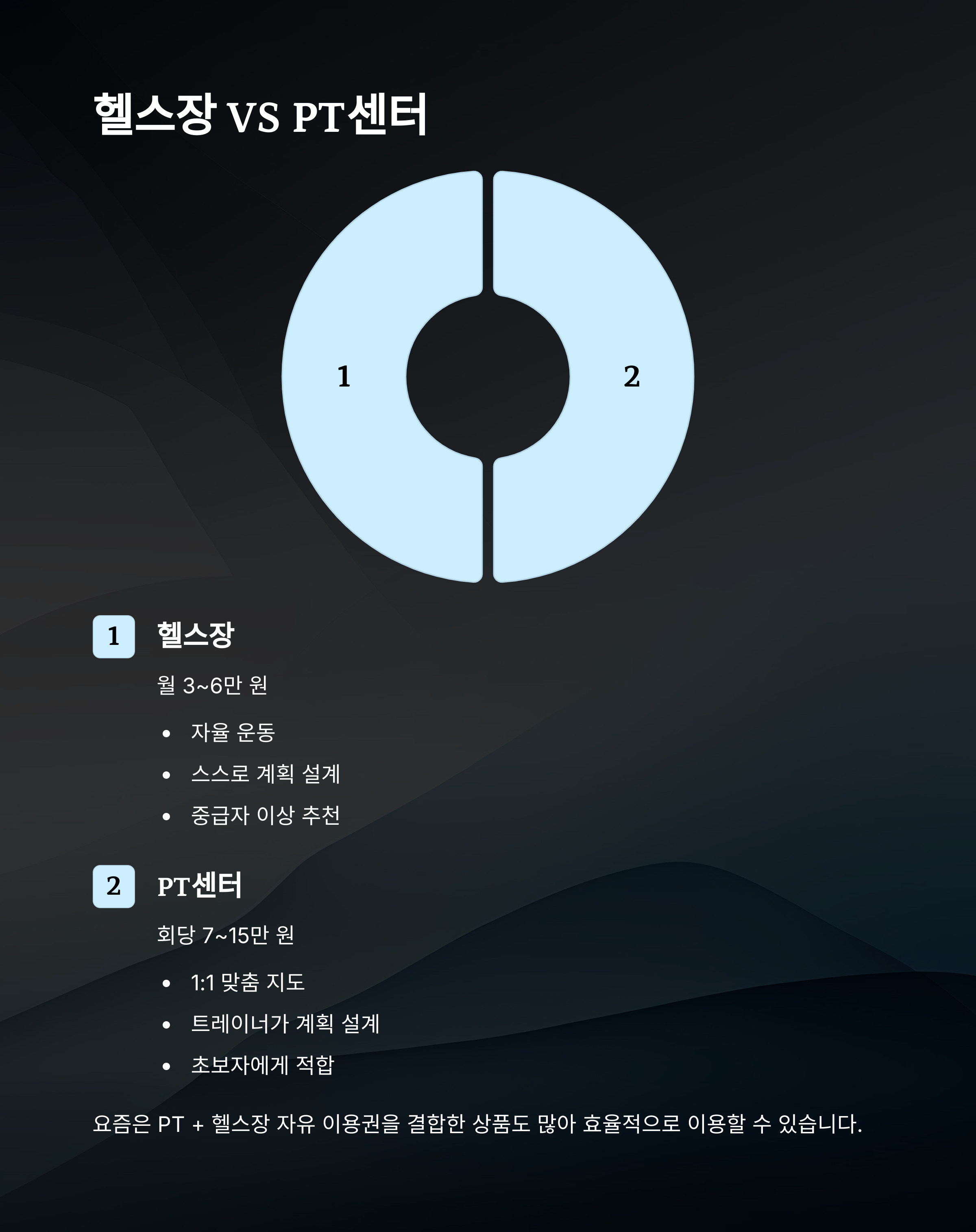 또한 요즘은 PT + 헬스장 자유 이용권을 결합한 상품도 많아요. PT는 일주일에 2회 받고, 나머지 날은 혼자 운동하면서 트레이너가 짠 루틴을 따라 하는 식이죠. 이런 방식은 비용도 아끼고 효율도 높일 수 있는 좋은 방법이에요.