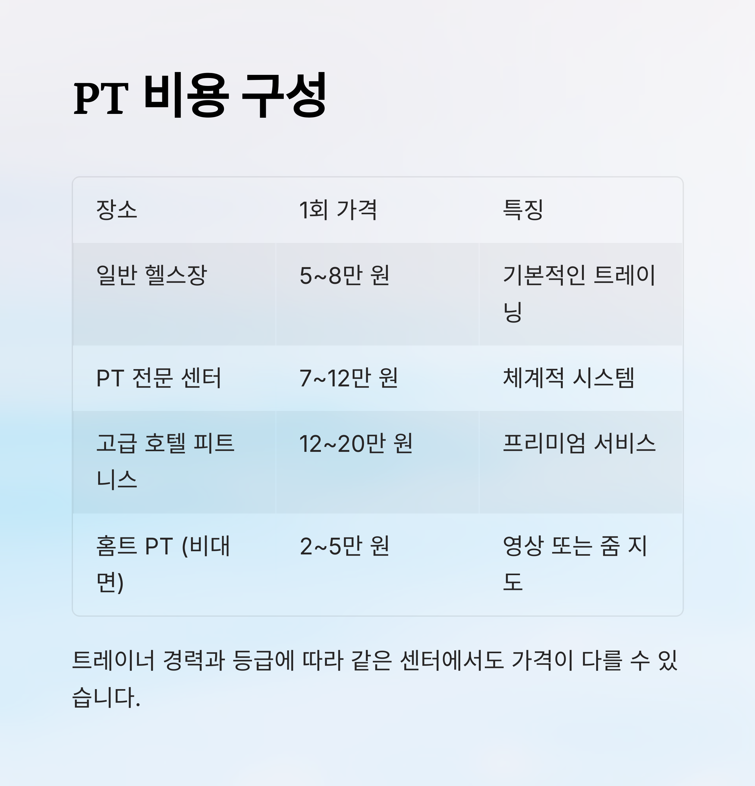 | 홈트 PT (비대면) | 2~5만 원 | 영상 또는 줌 | 운동만 제공 | 저렴하지만 한계 있음 |