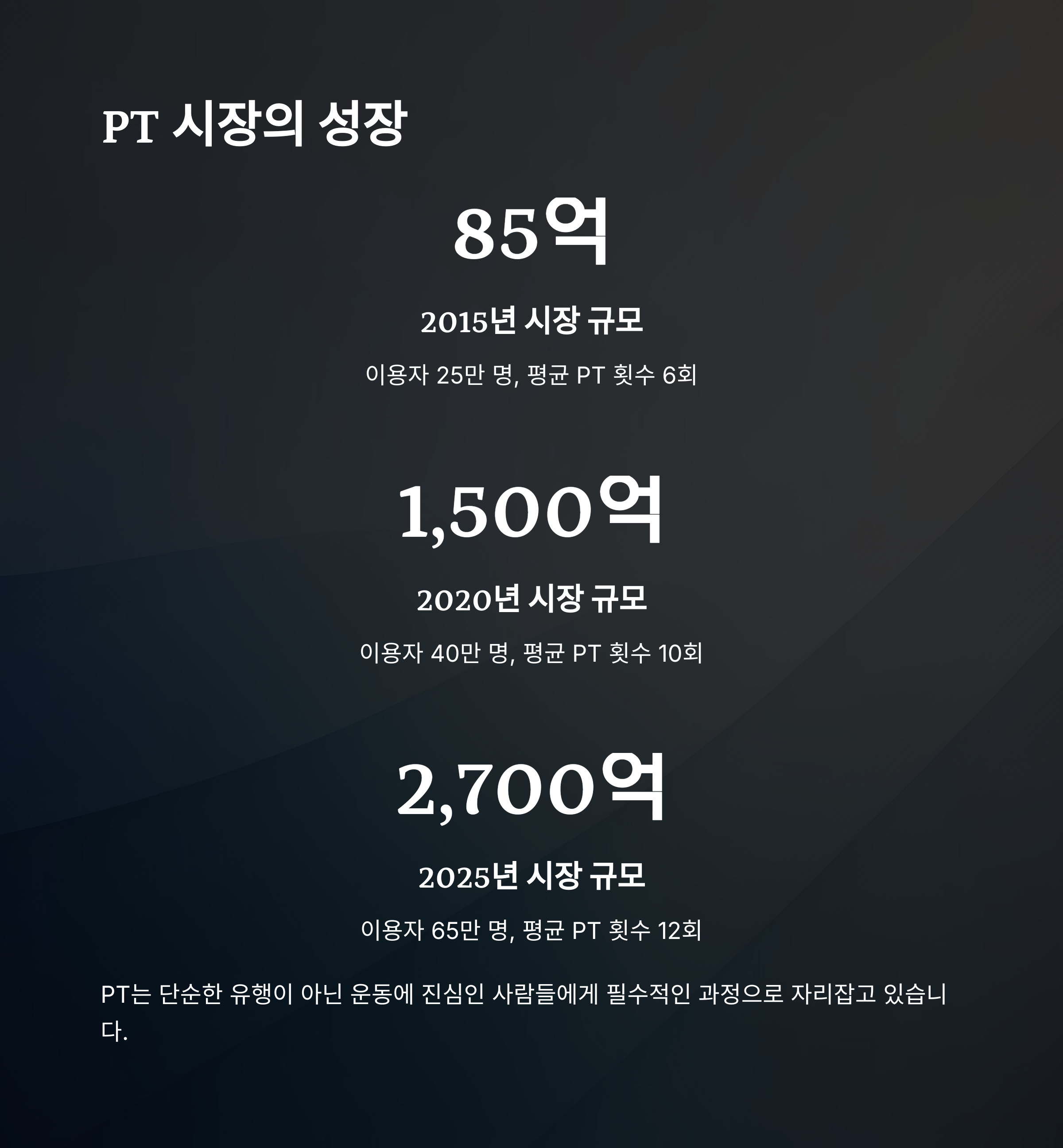 위 표에서 보듯 PT는 점점 보편적인 운동 방식으로 자리 잡고 있어요. 나의 생각으로는 PT가 단순한 유행이 아니라, 운동에 진심인 사람들에게 꼭 필요한 과정처럼 느껴졌어요.
