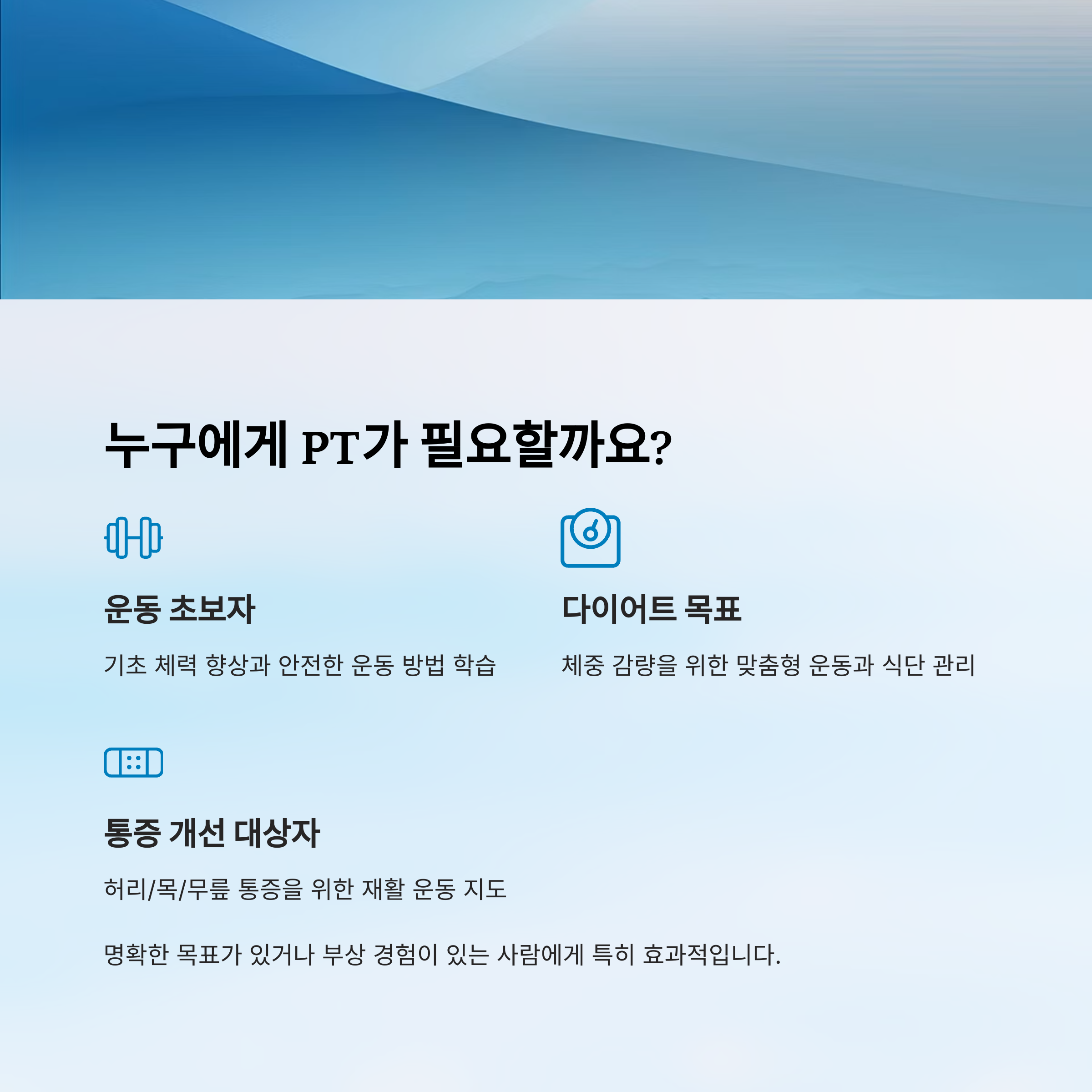 부상 경험이 있는 사람들도 PT가 꼭 필요해요. 허리 디스크, 무릎 통증, 거북목 같은 증상이 있는 사람은 잘못된 운동이 오히려 독이 될 수 있어요. 트레이너는 재활 목적의 운동도 함께 설계해주기 때문에, 안전하게 운동할 수 있도록 도와줘요.