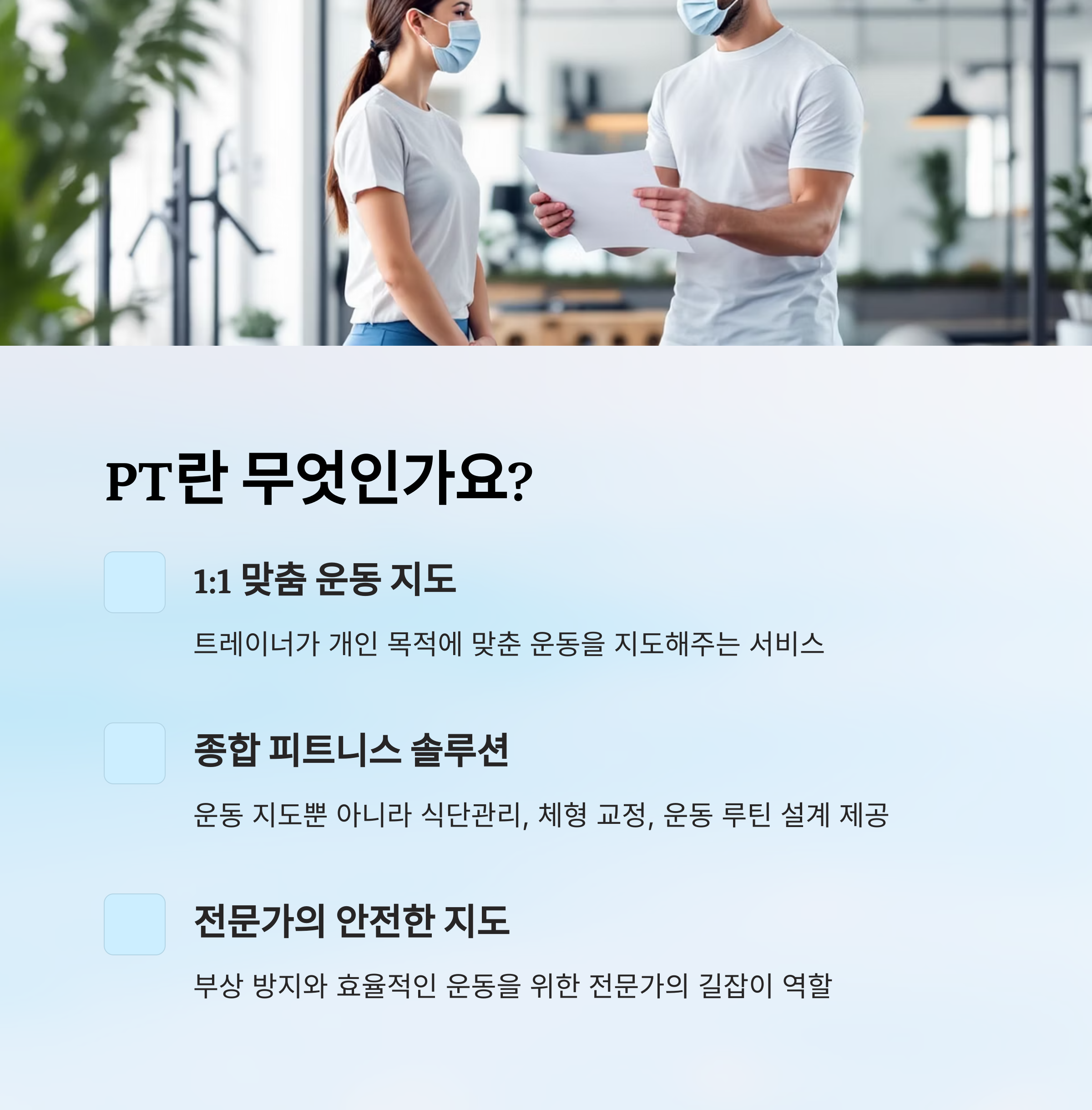PT는 단순히 운동만 가르쳐주는 게 아니라 식단관리, 체형 교정, 운동 루틴 설계 등 종합적인 피트니스 솔루션을 제공해줘요. 특히 운동 초보자나 부상 경험이 있는 사람들에게 안전하게 운동할 수 있는 길잡이 역할을 해요.